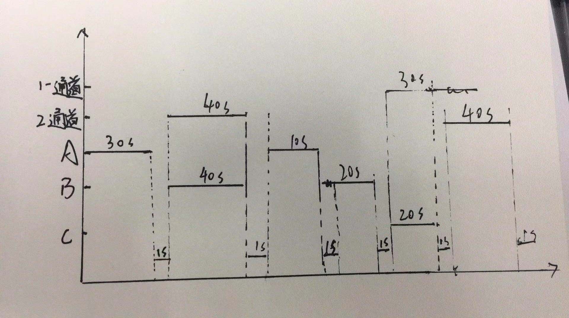 在内存中有三道进程并按ABC的顺序运行,其计算与IO操作时间如下图所示,如果每次进行进程切换时间为1ms,画出各进程状态转换的时间关系图。