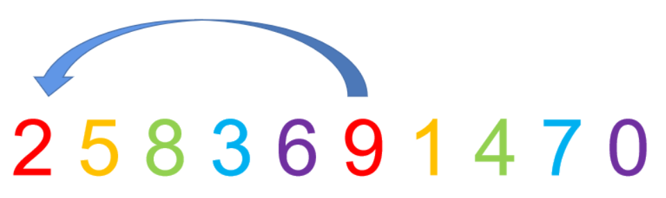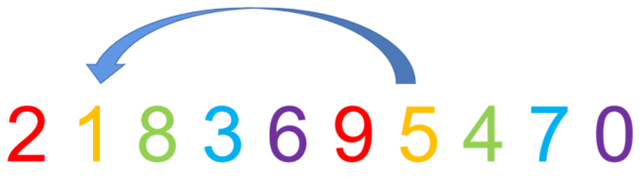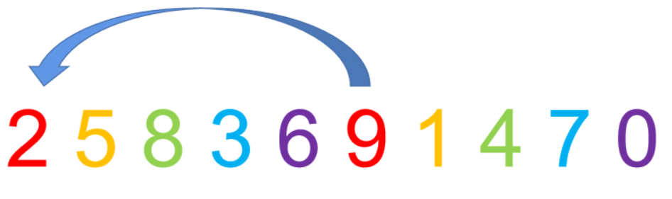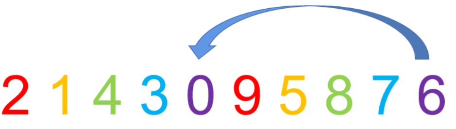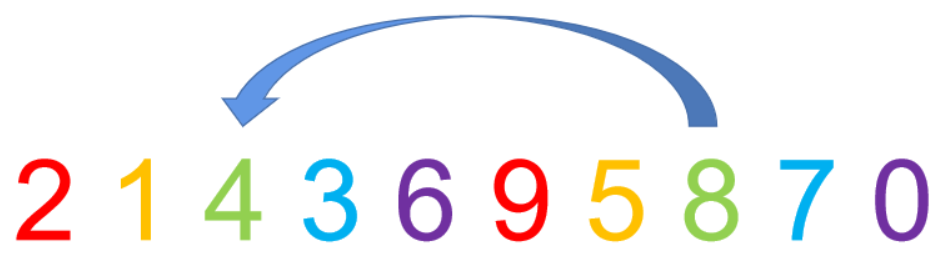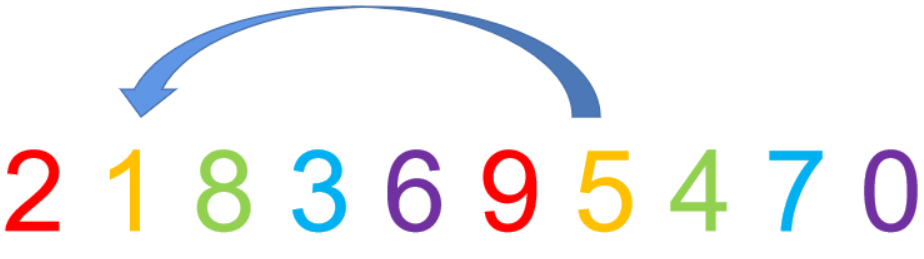 首先2和9位置不变, 然后5和1,需要改变,注意是组内直接插入,然后8和4 , 3和7 , 6和0 。