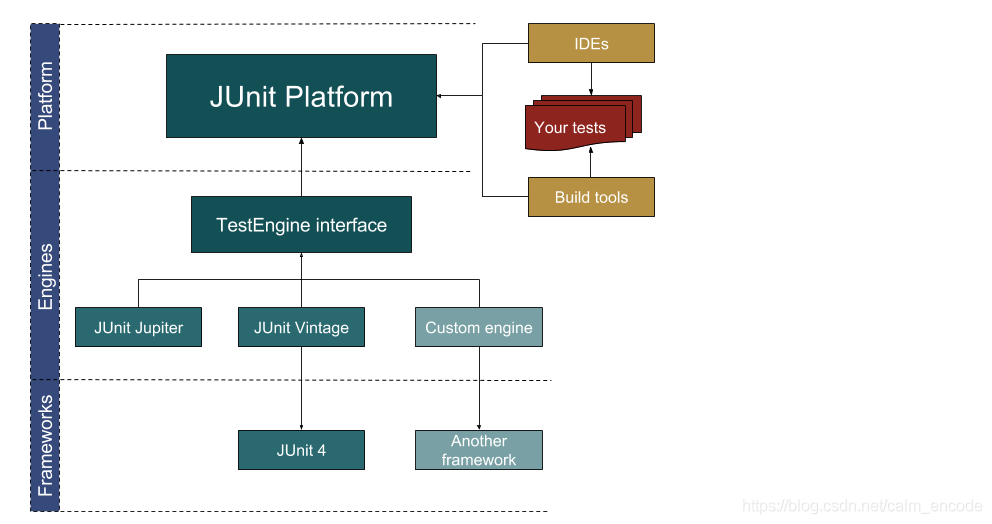 JUnit Platform为在JVM上启动测试框架提供基础。它还定义了TestEngine API, 用来开发在平台上运行的测试框架。此外,平台提供了一个控制台启动器,用于从命令行启动平台,并为Gradle和Maven提供构建插件以及基于JUnit 4的Runner,用于在平台上运行任意TestEngine。