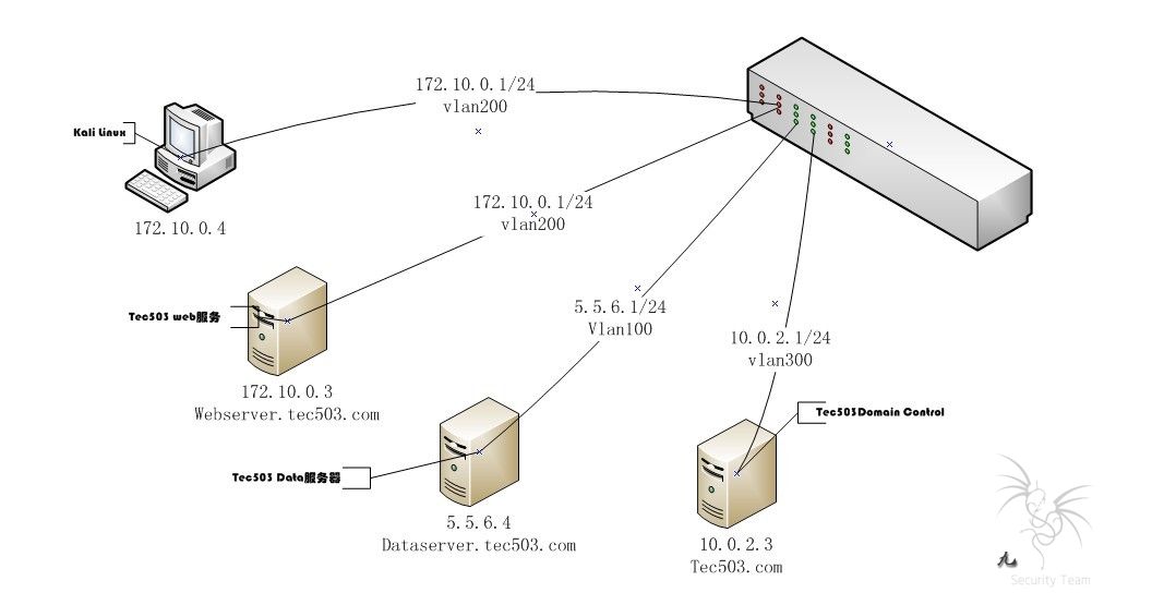 在交换机上划分了三个vlan 将Tec503(假想的目标公司)的数据服务器(dataserver.tec503.com)和web服务器(webserver.tec503.com)及域控分别划分在三个vlan(vlan100,vlan200,vlan300)下。vlan100和vlan200不能相互访问。但是都可以访问到vlan300.