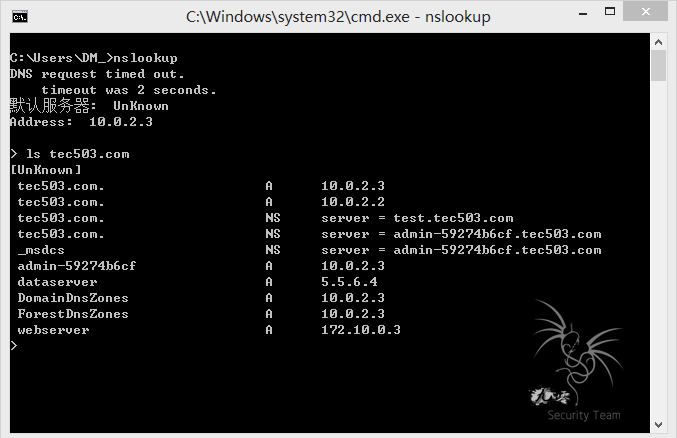 在前期信息搜集时发现tec503.com存在域传送漏洞.由此确定了此次测试的目标ip(5.5.6.4).