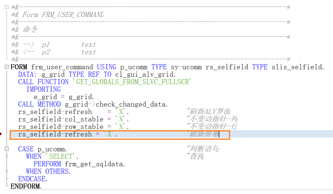 之前那个查找功能实现,是查找完之后,数据存在了gt_alv表中,但是屏幕上显示的还是之前的那个gt_alv的数据,所以,就想了个笨办法,就是再打开一个屏幕,这样显示的就是查到数据之后的了,但是这样有一个不好的地方就是又打开了一个屏幕,虽然不知道这样有什么坏处,但是感觉不好,所以做完查找这个功能之后就再网上查找关于刷新屏幕的办法,解决办法就是:在Form FRM_USER_COMMAND 中添加这个属性: rs_selfield-refresh = 'X'.