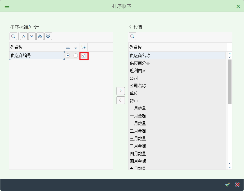 3. 点击小计,选择供应商编号【要注意,那个小计下边的要勾选上,不然没有用的】
