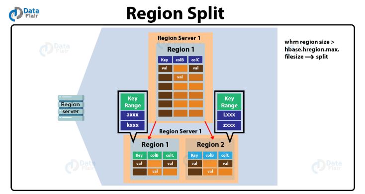随着业务的发展,在表中的数据会越来越多,Region会越来越大,这样会严重影响数据读取效率。所以当一个Region变的过大后,会触发Split操作,将一个Region分裂成两个子Region。Region的拆分分为自动拆分和手动拆分两种。