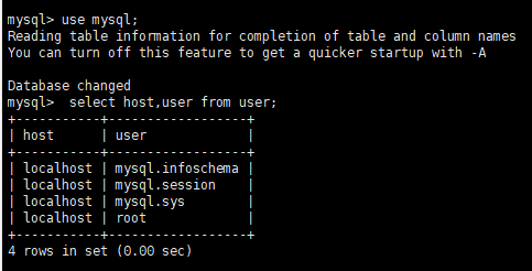 #选择数据库 use mysql; #查看用户和可以访问数据库的ip地址 select host,user from user;
