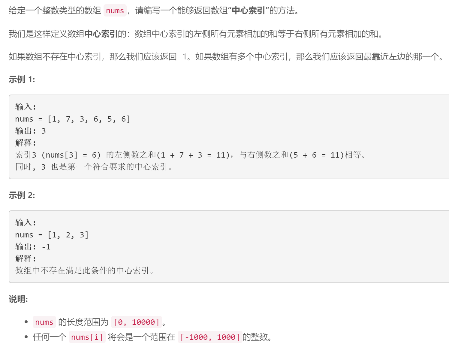 【LeetCode】【数组和字符串】寻找数组的中心索引