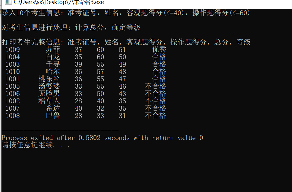 printf("\n打印考生完整信息: 准考证号,姓名,客观题得分,操作题得分,总分,等级\n");