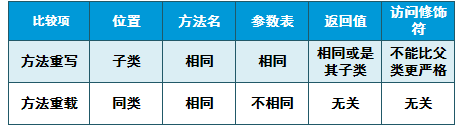 1、方法名相同、参数列表相同、返回值类型相同或者是其子类