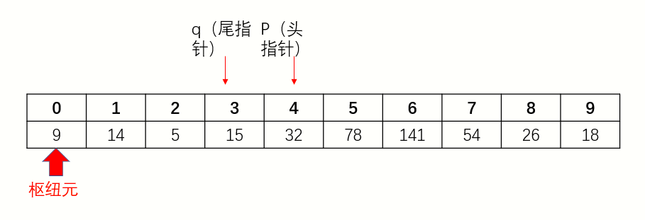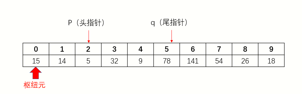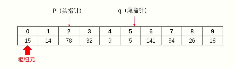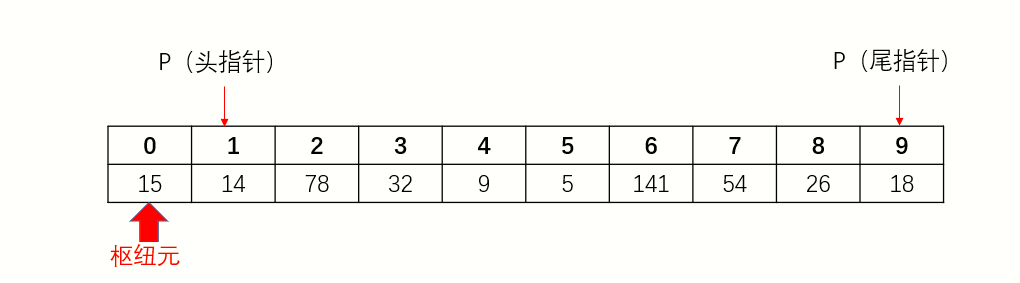 3、头指针向后移动,遇到比枢纽元大的停下。尾指针向前移动,遇到比枢纽元小的停下。