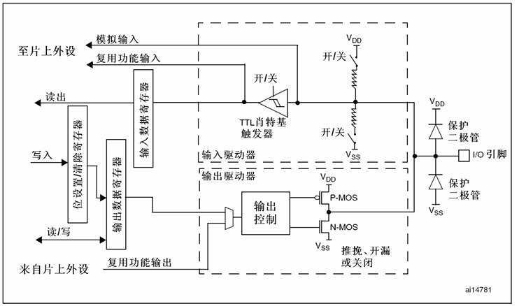 注意:模拟输入模式(如ADC)会绕过肖特基触发器,直接读取引脚电压。
