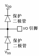 引脚的两个保护二级管可以防止引脚外部过高或过低的电压输入,当引脚电压高于VDD时,上 方的二极管导通,当引脚电压低于VSS时,下方的二极管导通,防止不正常电压引入芯片导致芯片烧毁。