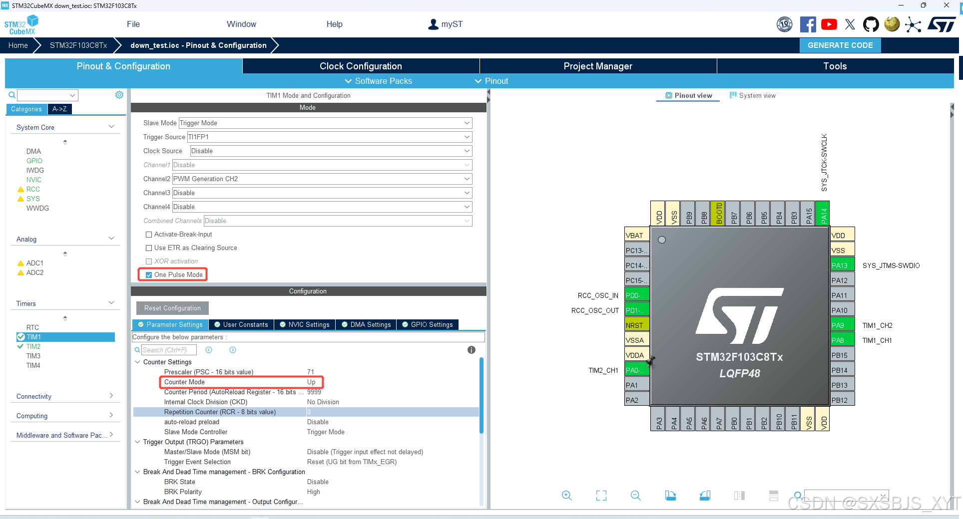 ① 该脉冲为周期性的,是在检测到零点信号的上升沿时触发的。查看代码定时器的配置为触发模式(触发通道TI1FP1)、上升沿触发,单脉冲模式、向下计数、CCR 初始值为0。在输入信号的上升沿时确实也触发了从定时器的单脉冲输出,这块逻辑应该是正确的。