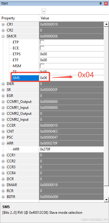 也就是说,向下计数,在PWM模式1,当TIMx_CNT≤TIMx_CCRx时参考信号OCxREF为高。代码是向下计数且CCR初始值为0,计数器从自动重转载值(ARR)开始递减至0时,也就是1与0之间的瞬间,触发了比较事件,导致有效电平持续了一个时钟周期。