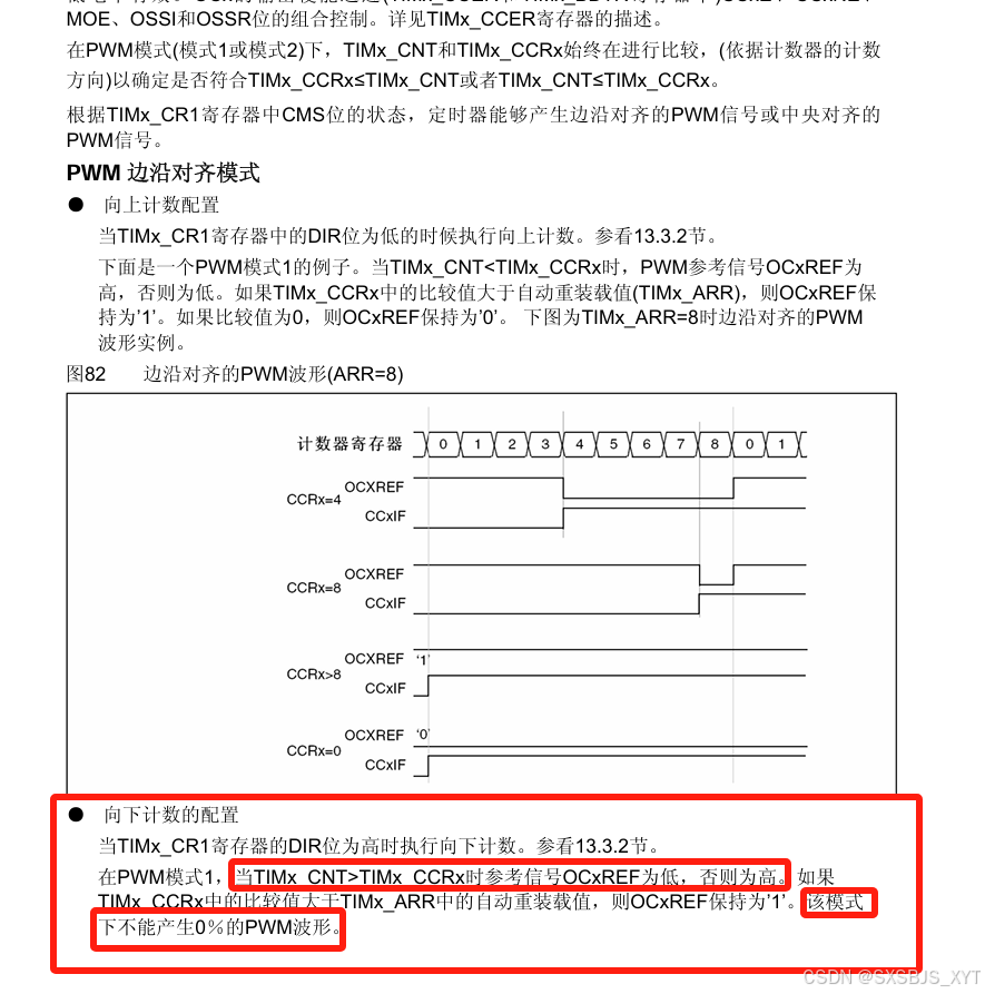 参考手册中说“在PWM模式1,当TIMx_CNT>TIMx_CCRx时参考信号OCxREF为低,否则为高。如果 TIMx_CCRx中的比较值大于TIMx_ARR中的自动重装载值,则OCxREF保持为’1’。该模式 下不能产生0%的PWM波形。”