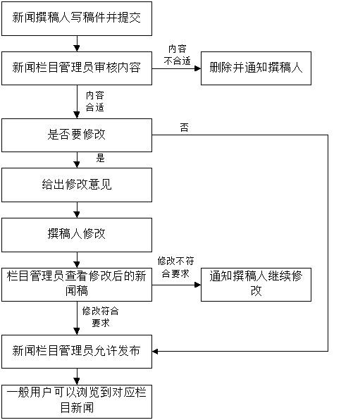 河北省环保监测中心网络新闻为搭建公众信息交流平台,决定建立新闻发布平台。新闻发布平台按内容包括中心新闻、企业环保信息发布等若干新闻栏目,新闻撰稿人可登陆平台发布新闻,每个新闻栏目至少有一位新闻栏目管理员,负责审查新闻撰稿人所发的新闻稿件,在审查通过后,对应新闻才可以显示在对应新闻栏目上,一般用户登录后才可以看到,另外还可以删除过时或无用的信息。另外,系统管理员可以对用户进行管理和对新闻栏目进行调整。新闻发布流程如下: