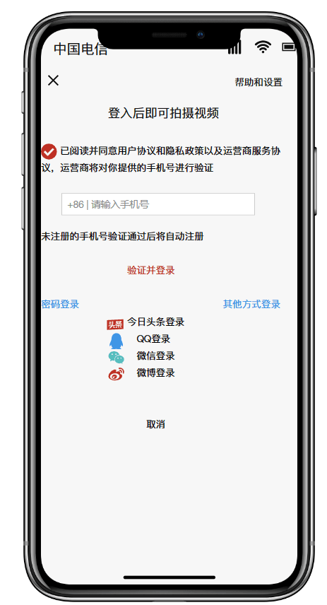 qq登入 手机号登入 微信登入 微博登入 今日头条登入 帮助和设置