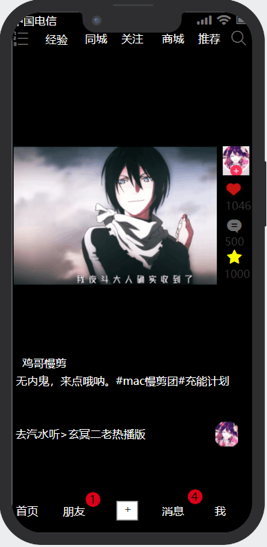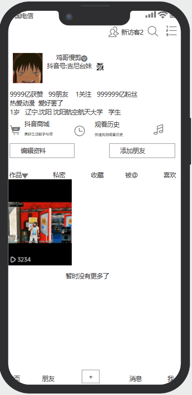 用户可以观看和修改自己的资料,添加朋友,也可以去商城购物,也可以观看自己的视频