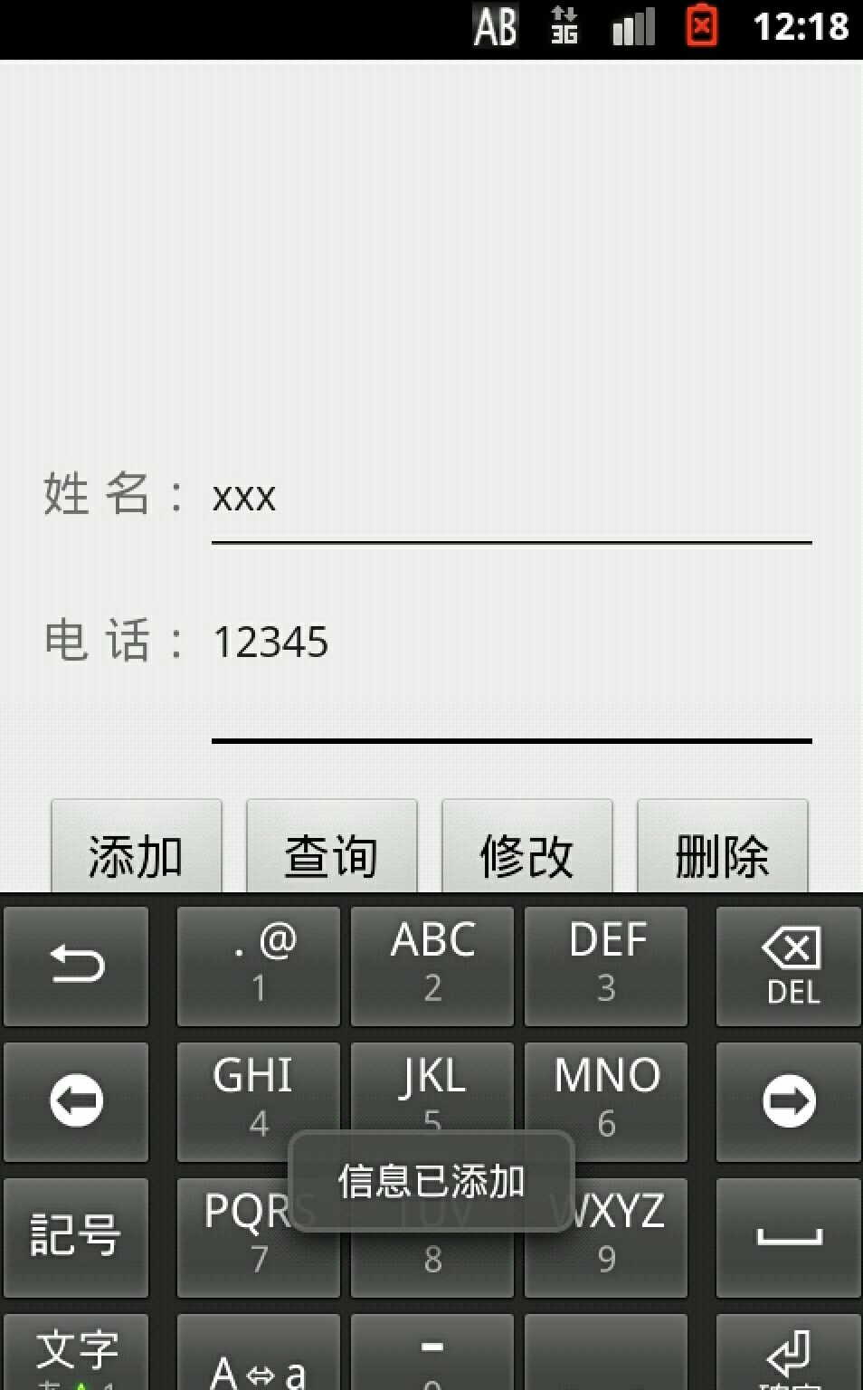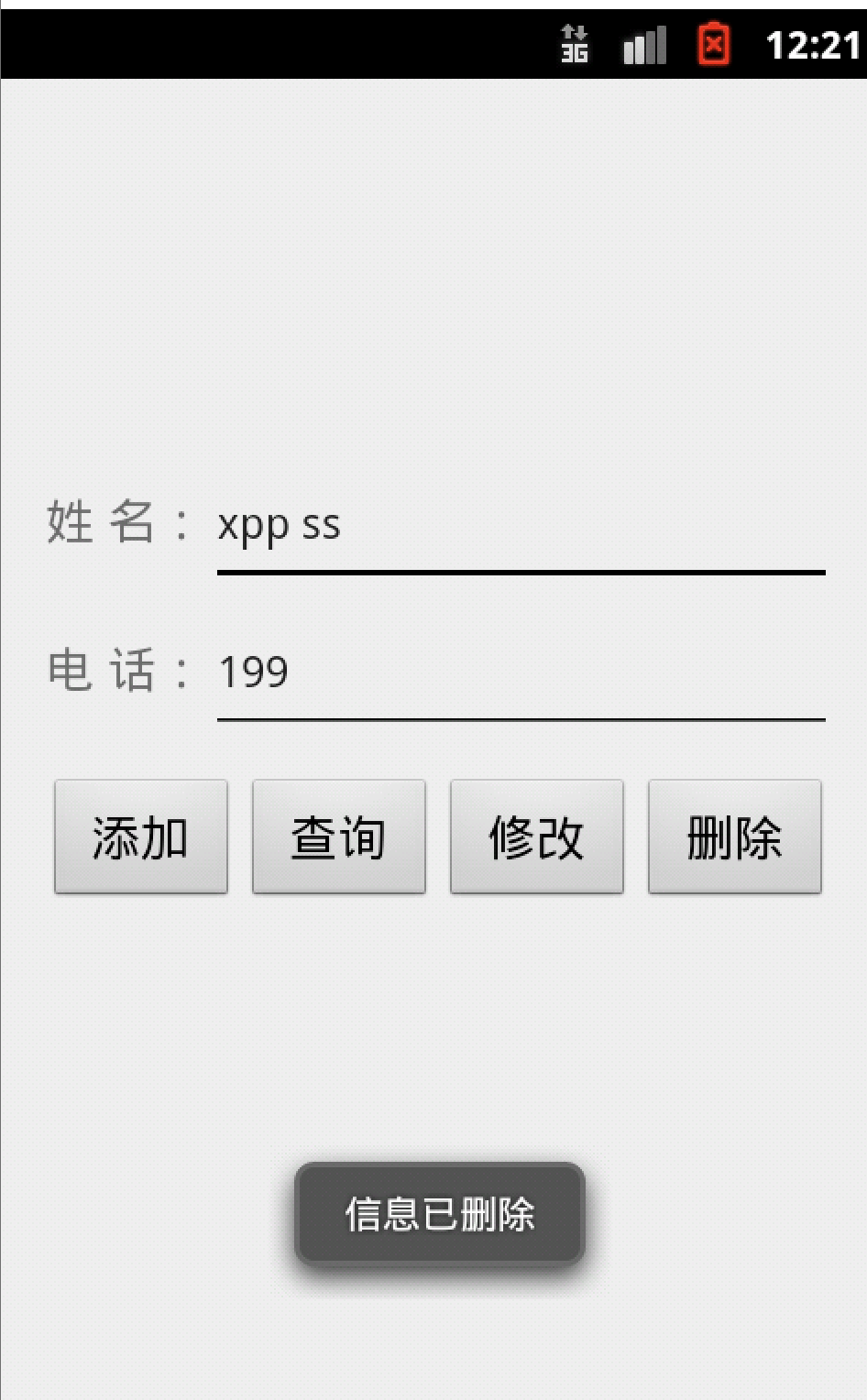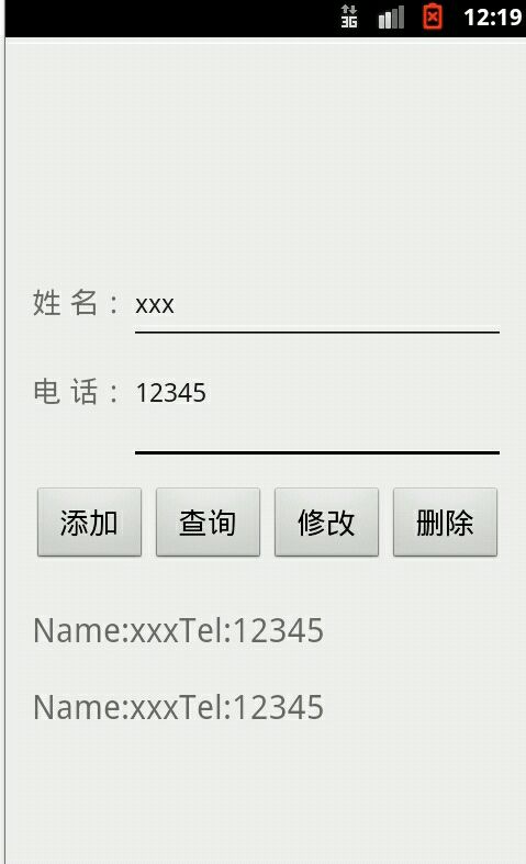 <?xml version="1.0" encoding="utf-8"?> <LinearLayout xmlns:android="http://schemas.android.com/apk/res/android" xmlns:tools="http://schemas.android.com/tools" android:layout_width="match_parent" android:layout_height="match_parent" tools:context=".MainActivity" android:padding="16dp" android:orientation="vertical"> <LinearLayout android:layout_width="match_parent" android:layout_height="wrap_content" android:layout_marginTop="130dp" android:orientation="horizontal" > <TextView android:layout_width="wrap_content" android:layout_height="wrap_content" android:text="姓 名:" android:textSize="18sp" /> <EditText android:id="@+id/et_name" android:layout_width="match_parent" android:layout_height="wrap_content" android:hint="请输入姓名" android:textSize="16sp" /> </LinearLayout> <LinearLayout android:layout_width="match_parent" android:layout_height="wrap_content" android:orientation="horizontal" android:layout_marginTop="15dp" > <TextView android:layout_width="wrap_content" android:layout_height="wrap_content" android:text="电 话:" android:textSize="18sp" /> <EditText android:id="@+id/et_phone" android:layout_width="match_parent" android:layout_height="wrap_content" android:hint="请输入手机号码" android:textSize="16sp" /> </LinearLayout> <LinearLayout android:layout_width="match_parent" android:layout_height="wrap_content" android:layout_marginTop="15dp" > <Button android:id="@+id/add" android:layout_width="0dp" android:layout_height="wrap_content" android:layout_marginRight="2dp" android:layout_weight="1" android:text="添加" android:textSize="18sp"/> <Button android:id="@+id/query" android:layout_width="0dp" android:layout_height="wrap_content" android:layout_marginRight="2dp" android:layout_weight="1" android:text="查询" android:textSize="18sp"/> <Button android:id="@+id/update" android:layout_width="0dp" android:layout_height="wrap_content" android:layout_marginRight="2dp" android:layout_weight="1" android:text="修改" android:textSize="18sp"/> <Button android:id="@+id/delete" android:layout_width="0dp" android:layout_height="wrap_content" android:layout_marginRight="2dp" android:layout_weight="1" android:text="删除" android:textSize="18sp"/> </LinearLayout> <TextView android:id="@+id/tv_show" android:layout_width="match_parent" android:layout_height="wrap_content" android:layout_marginTop="25dp" android:textSize="20sp" /> </LinearLayout>