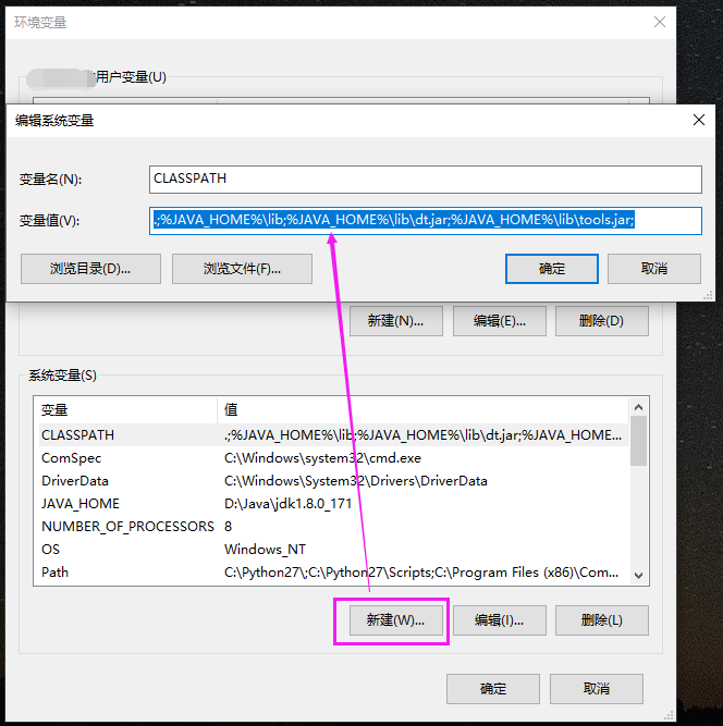 - 添加“CLASSPATH”变量:点击“系统变量”下的“新建”,在弹出的新建对话框中,添加以下内容: