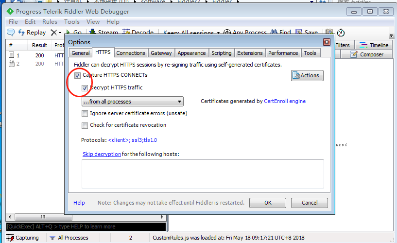 安装证书:到Fiddler的Tools-options-https下,勾选Capture HTTPS CONNECTS 勾选Decrypt HTTPS traffic