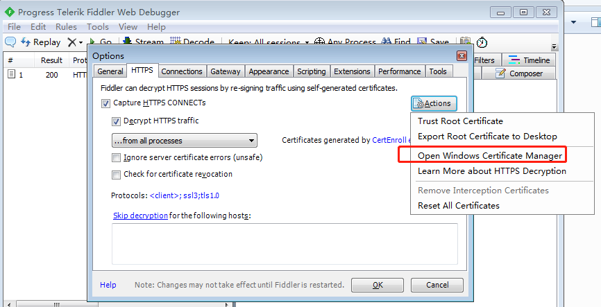 win7下Fiddler证书安装之后,总是无法抓取https的包;网上搜了很多方法都没解决问题,最终摸索解决方法如下: