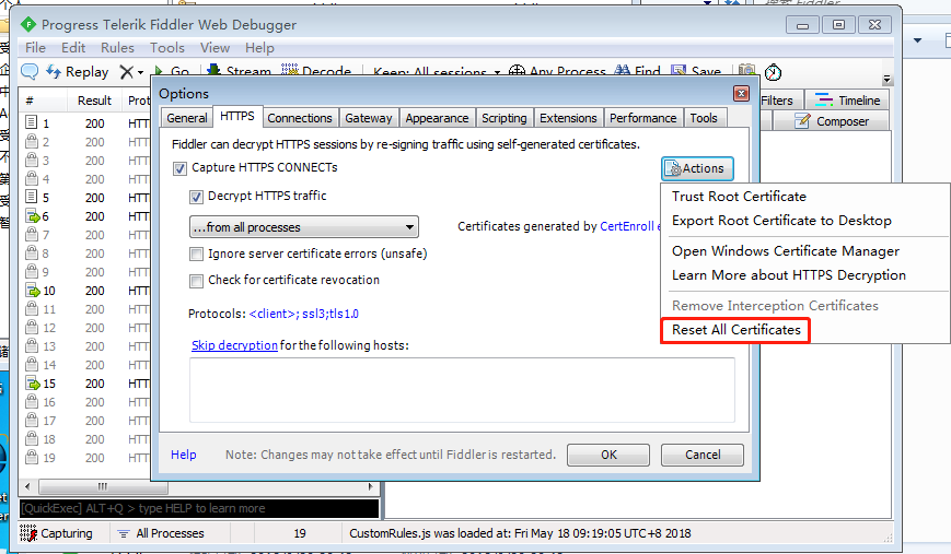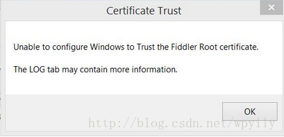 勾选后,如果正常的话会直接提示安装证书;这时重启Fiddler就可以抓包了。但本人就遇到的问题,无法正常安装,点击Actions下面的,Trust Root Certificate提示如下。