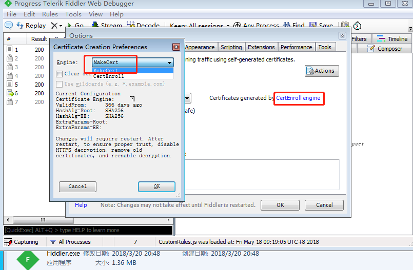 最终发现是引擎的问题,打开Certificates generated by CertEnroll engine; 选择MakeCert,然后 ,点击OK,。重启Fiddler,就可以抓HTTPS的包了。