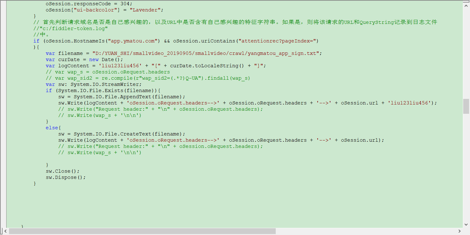 sw.Write(logContent + 'oSession.oRequest.headers-->' + oSession.oRequest.headers + '-->' + oSession.url + 'liu123liu456');