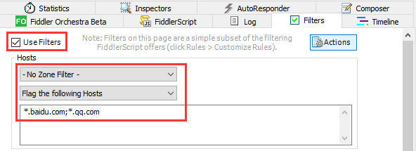 切换到fiddler右侧窗口的Filters选项卡