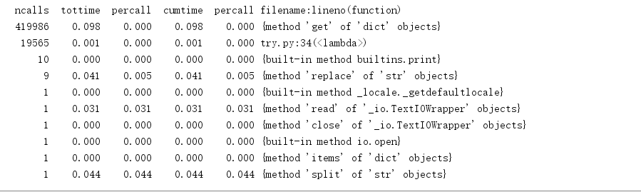p.strip_dirs().sort_stats("call").print_stats(10)# 按照函数名排序,只打印前3行函数的信息, 参数还可为小数,表示前百分之几的函数信息