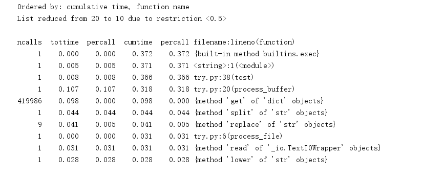 p.strip_dirs().sort_stats("cumulative", "name").print_stats(0.5)# 按照运行时间和函数名进行排序