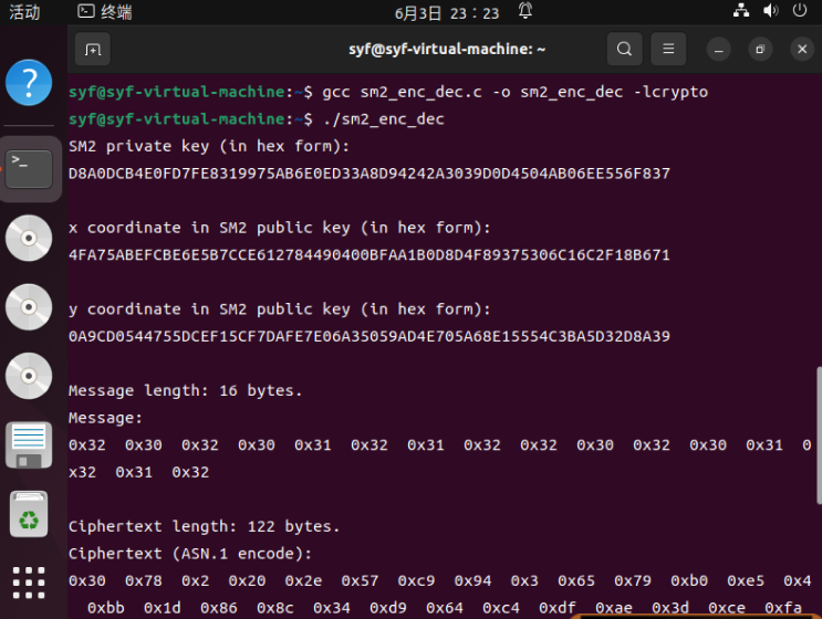 - 编译运行 https://github.com/greendow/SM2-encrypt-and-decrypt 中的代码提交运行结果与截图(8’)