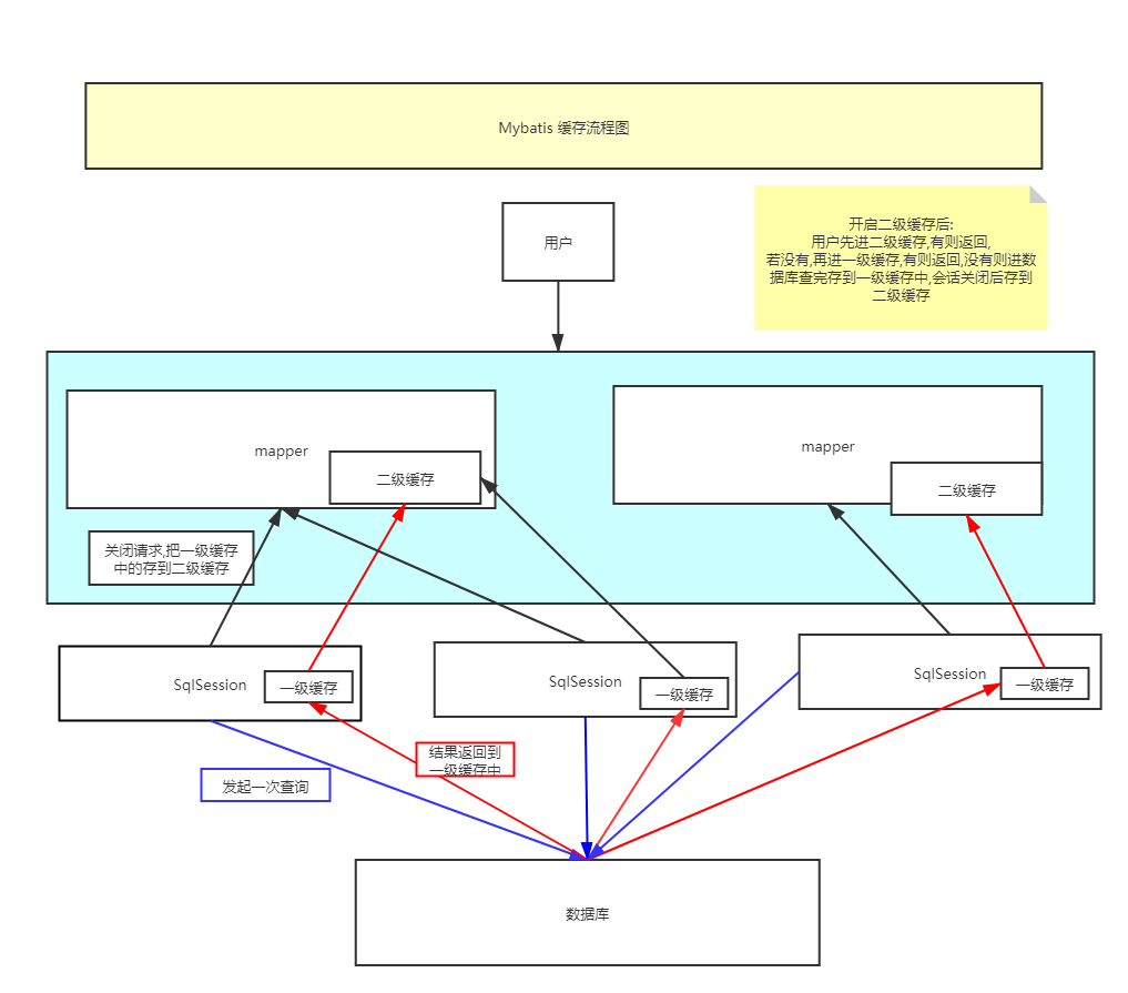 默认情况下,只启用了本地的会话缓存,它仅仅对一个会话中的数据进行缓存。 要启用全局的二级缓存,只需要在你的 SQL 映射文件中添加一行: