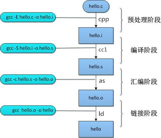 在Linux下使用GCC将源码编译成可执行文件的过程可以分解为4个步骤,分别是预处理、编译、汇编和链接。一个hello word程序编译过程如下: