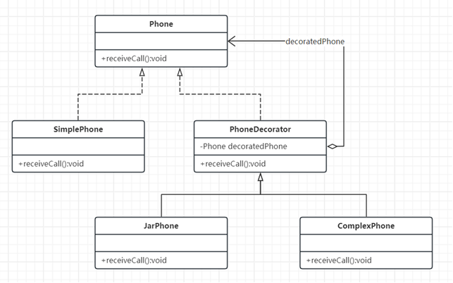 package test11; public interface Phone { void receiveCall(); } package test11; public abstract class PhoneDecorator implements Phone { protected Phone decoratedPhone; public PhoneDecorator(Phone decoratedPhone) { this.decoratedPhone = decoratedPhone; } @Override public void receiveCall() { decoratedPhone.receiveCall(); } }
