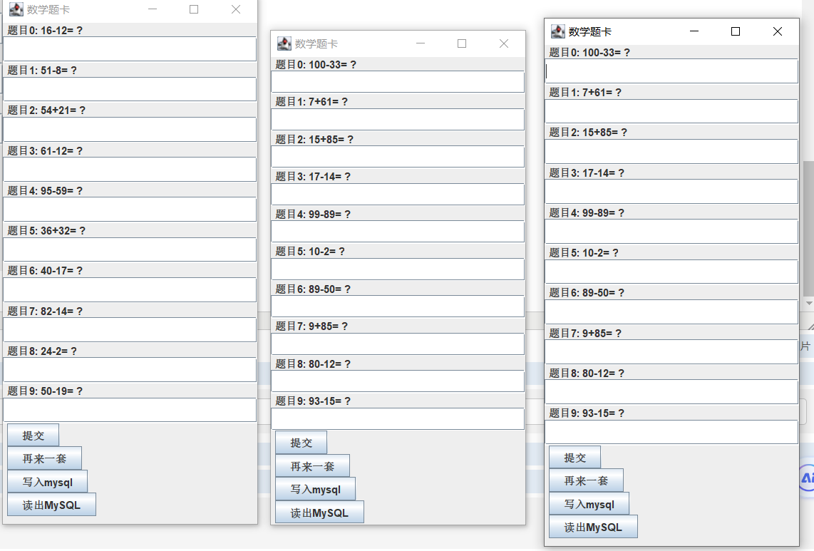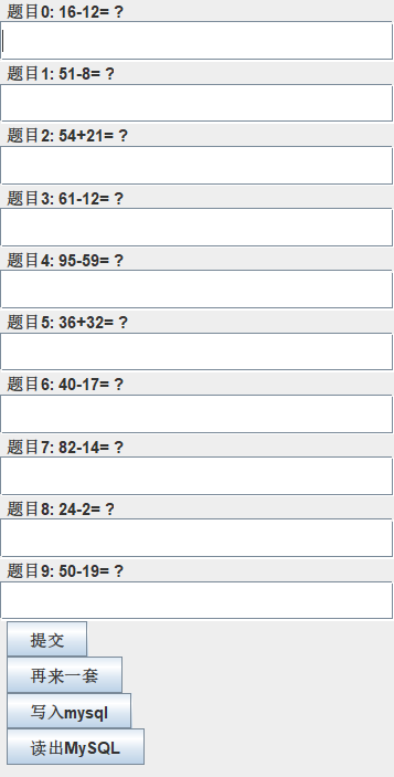 package com.example.test; import java.sql.*; import java.util.ArrayList; import java.util.List; public class JDBC { private static Connection connection; private static String url="jdbc:mysql://localhost:3306/?useSSL=false&allowPublicKeyRetrieval=true&serverTimezone=UTC"; private static String user="root"; private static String pass=""; static { try { Class.forName("com.mysql.cj.jdbc.Driver"); }catch(ClassNotFoundException e){ e.printStackTrace(); } } public static Connection getConnection() { try { connection=DriverManager.getConnection(url,user,pass); }catch(SQLException e) { e.printStackTrace(); } return connection; } public static List<Question> find(int num) {//查询 Connection conn=JDBC.getConnection(); PreparedStatement pre=null; ResultSet res=null; List<Question> questionList=new ArrayList<>(); String str=null; String sql="SELECT * FROM questions limit "+num; try { pre=conn.prepareStatement(sql); res=pre.executeQuery(); while(res.next()) { String name=res.getString ("ques"); int pass=res.getInt("res"); Question question=new Question(name,pass); questionList.add(question); } } catch(SQLException e) { e.printStackTrace(); System.out.println("查询错误"); }finally{ JDBC.release(conn, pre, res); } return questionList; } public static void add(List<Calculate> questionList) {//添加 Connection connn=JDBC.getConnection(); try { for(int i=0;i<questionList.size();i++) { Calculate calculate=questionList.get(i); String sql="insert into questions (ques,res) values (?,?) "; PreparedStatement ps = connn.prepareStatement(sql); ps.setString(1, calculate.toString()); ps.setInt(2, calculate.getResult()); ps.executeUpdate(); } } catch(SQLException e) { e.printStackTrace(); System.out.println("insert错误"); }finally{ JDBC.release(connn, null, null); } } public static void release(Connection connection,Statement statement,ResultSet resultSet) { try { if(connection!=null) { connection.close(); } if(statement!=null) { statement.close(); } if(resultSet!=null) { resultSet.close(); } } catch(SQLException e) { e.printStackTrace(); } } }