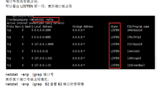 即可显示当前服务器上所有端口及进程服务,于grep结合可查看某个具体端口及服务情况。