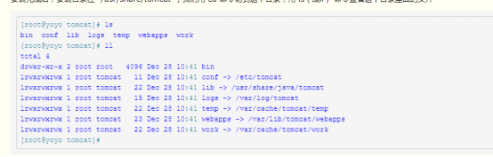 安装完成后,安装目录在 "/usr/share/tomcat" , 我们用 cd 命令切到这个目录,用 ls(或ll) 命令查看这个目录里面的文件