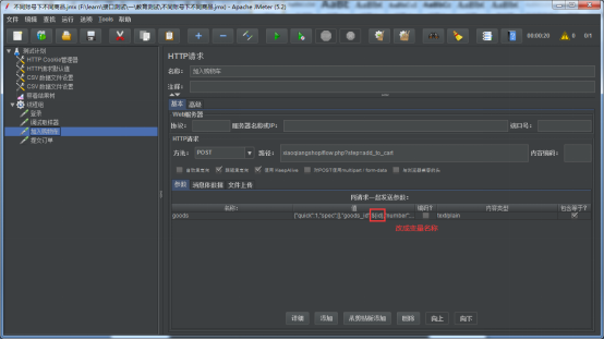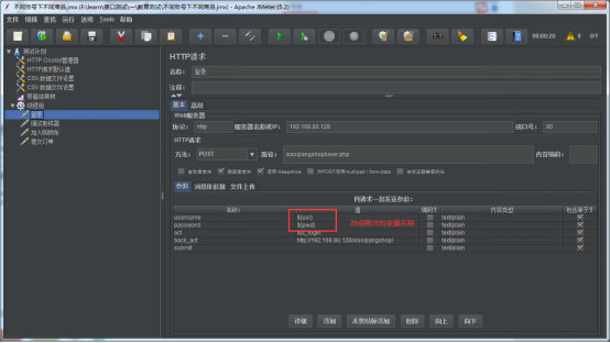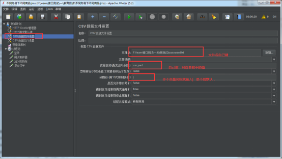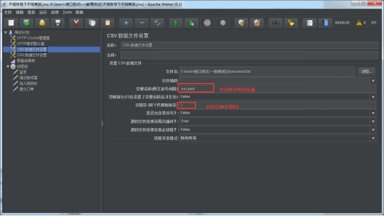 在CSV数据文件设置中,要设置两个变量分别存放账号,密码。分隔符自己定义即可,这里用了”|”,也可以用默认的逗号。