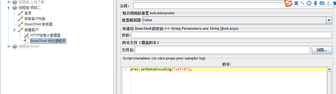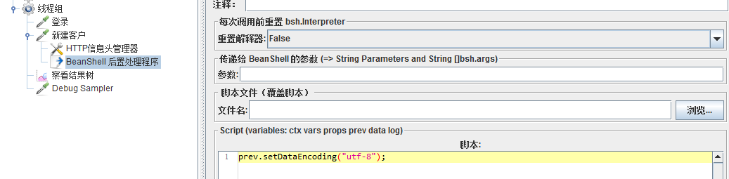 还有一种情况是响应出现乱码,响应出现乱码解决办法也是修改JMeter的配置文件,还有就是加一个BeanShell后置处理器,在script中加入脚本:prev.setDataEncoding("utf-8");
