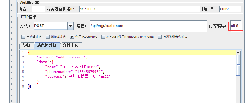 添加HTTP请求时在Content encoding后填入编码:utf-8