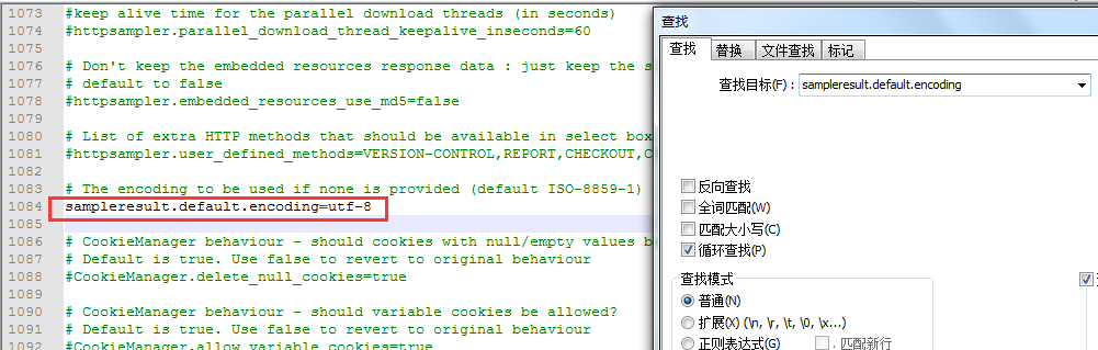 找到sampleresult.default.encoding这个参数,此行默认是注释的。把注释去掉,把ISO-8859-1改成utf-8,保存,重启JMeter。