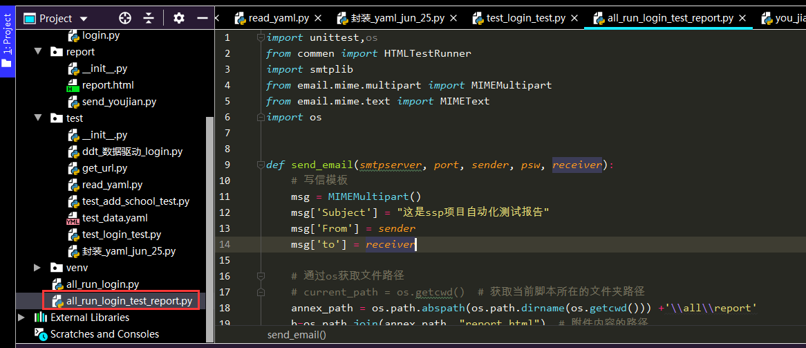# coding:utf-8 import smtplib from email.mime.text import MIMEText # 参数配置 smtpserver = "smtp.qq.com" # 发送邮件的服务器 port = 465 # 端口 sender = "3437871062@qq.com" # 发送的邮箱 psw = "tdcejfnutrascjee" # QQ授权码,这里填写上自己的授权码 # receiver = "1039020476@qq.com" # 接收邮件的邮箱 receiver = ['3437871062@qq.com', '1039020476@qq.com'] # 用列表装多个领导的邮箱 # 写信模板 body = '<pre><h1>测试报告,请查收`</h1></pre>' msg = MIMEText(body, 'html', "utf-8") msg['from'] = sender msg['to'] = ','.join(receiver) # 用join处理一下,分别发送 msg['subject'] = "这是自动化测试报告" # 邮件的主题 # 写信流程 try: smtp1 = smtplib.SMTP_SSL(smtpserver, port) # 实例化 smtp1.login(sender, psw) # 登录 smtp1.sendmail(sender, msg['to'].split(','), msg.as_string()) # 配置发送邮箱,接收邮箱,以及发送内容 smtp1.quit() # 关闭发邮件服务 print("邮件发送成功!") except smtplib.SMTPException: print("Error: 抱歉!发送邮件失败。")