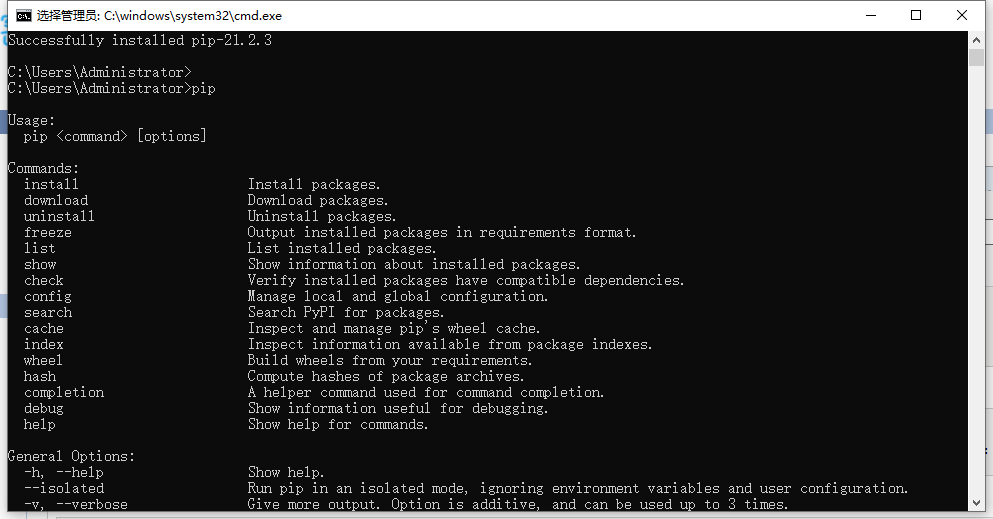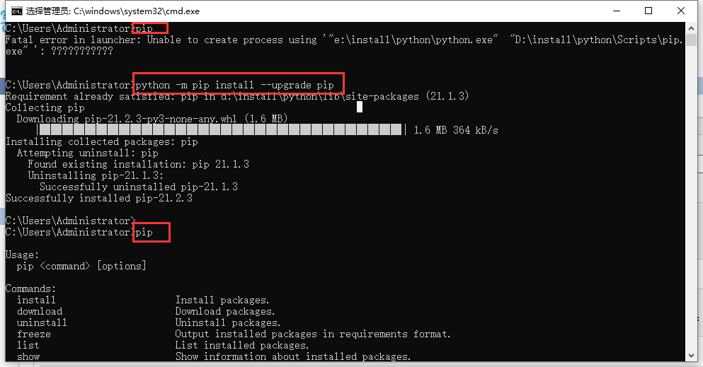 C:\Users\Administrator>pip Fatal error in launcher: Unable to create process using '"e:\install\python\python.exe" "D:\install\python\Scripts\pip.exe" ': ???????????
