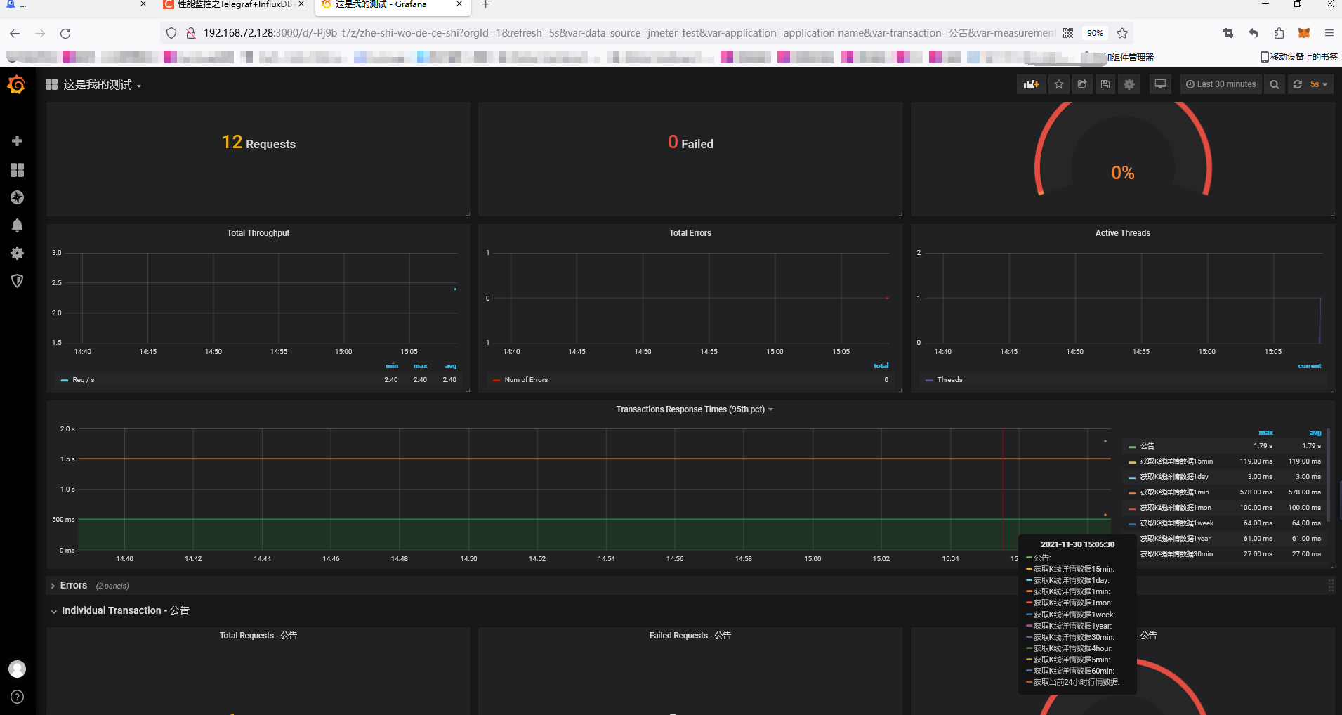 因此如果有一个性能测试结果实时展示的页面,可以提高我们对系统性能表现的掌握程度,另一方面也提高了我们的测试效率。所以我们现在用InfluxDB+Grafana对性能结果进行实时监控,把JMeter的压测结果写入InfluxDB,然后通过Grafana展示出来。