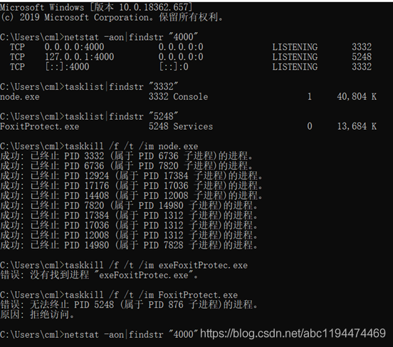 执行 netstat -aon|findstr “4000”,找到PID,发现PID为“3332”和“5248”被占用 4000是你目前项目使用的端口号