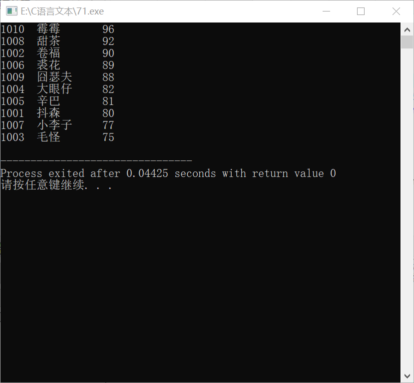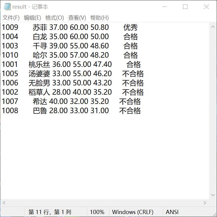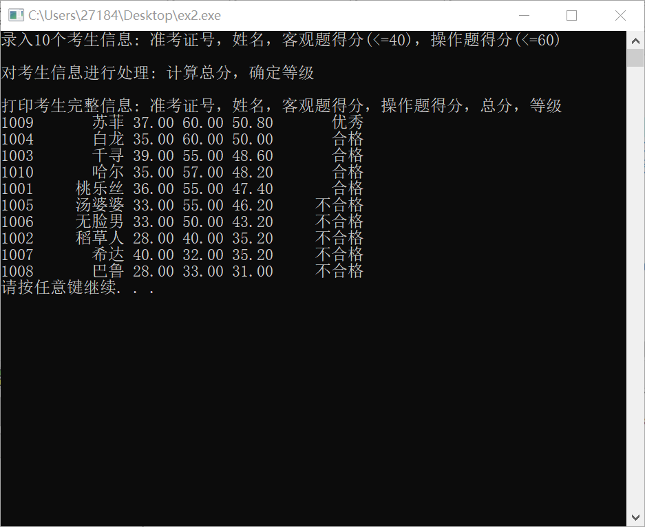 #include <stdio.h> #include <stdlib.h> #include <string.h> const int N = 10; // 定义结构体类型struct student,并定义其别名为STU typedef struct student { long int id; char name[20]; float objective; /*客观题得分*/ float subjective; /*操作题得分*/ float sum; char level[10]; }STU; // 函数声明 void input(STU s[], int n); void output(STU s[], int n); void process(STU s[], int n); int main() { STU stu[N]; printf("录入%d个考生信息: 准考证号,姓名,客观题得分(<=40),操作题得分(<=60)\n", N); input(stu, N); printf("\n对考生信息进行处理: 计算总分,确定等级\n"); process(stu, N); printf("\n打印考生完整信息: 准考证号,姓名,客观题得分,操作题得分,总分,等级\n"); output(stu, N); system("pause"); return 0; } // 从文本文件examinee.txt读入考生信息:准考证号,姓名,客观题得分,操作题得分 void input(STU s[], int n) { FILE *fin;// 定义文件类型指针 int i; fin=fopen("E:\\examinee.txt","r");// 以只读文本方式打开文件examinee.txt if( !fin ) { // 如果打开失败,则输出错误提示信息,然后退出程序 printf("fail to open examinee\n"); exit(0); } for(i=0;i<n;i++) fscanf(fin,"%ld %s %f %f",&s[i].id,&s[i].name,&s[i].objective,&s[i].subjective); // 从fin指定的文件中格式化读取学生信息 fclose(fin);// 关闭fin指向的文件 } // 输出考生完整信息: 准考证号,姓名,客观题得分,操作题得分,总分,等级 // 不仅输出到屏幕上,还写到文本文件result.txt中 void output(STU s[], int n) { FILE *fout;// 定义文件类型指针 int i; fout=fopen("result.txt","w");// 以写文本方式打开文件result.txt, 如果文件不存在,就创建一个 if( !fout ) { // 如果打开失败,则输出错误提示信息,然后退出程序 printf("fail to open result.txt\n"); exit(0); } // 将排序后的数组st中数据输出到屏幕,同时,也写入文件result.txt for(i=0;i<n;i++){ printf("%ld %10s %5.2f %5.2f %5.2f %10s\n",s[i].id,s[i].name,s[i].objective,s[i].subjective,s[i].sum,s[i].level); fprintf(fout,"%ld %10s %5.2f %5.2f %5.2f %10s\n",s[i].id,s[i].name,s[i].objective,s[i].subjective,s[i].sum,s[i].level); } fclose(fout);// 关闭fout指向的文件 } // 对考生信息进行处理:计算总分,排序,确定等级 void process(STU s[], int n) { int i,j; STU temp; for(i=0;i<n;i++) s[i].sum=s[i].objective*0.4+s[i].subjective*0.6; for(i=0;i<n-1;i++) for(j=0;j<n-1-i;j++) if(s[j].sum<s[j+1].sum) { temp = s[j]; s[j] = s[j+1]; s[j+1] = temp; } for(i=0;i<n;i++){ if(i<0.1*n) strcpy(s[i].level,"优秀"); else if(i>=0.1*n&&i<0.5*n) strcpy(s[i].level,"合格"); else strcpy(s[i].level,"不合格"); } }