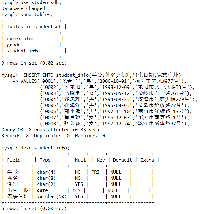 mysql> INSERT INTO student_info(学号,姓名,性别,出生日期,家族住址)