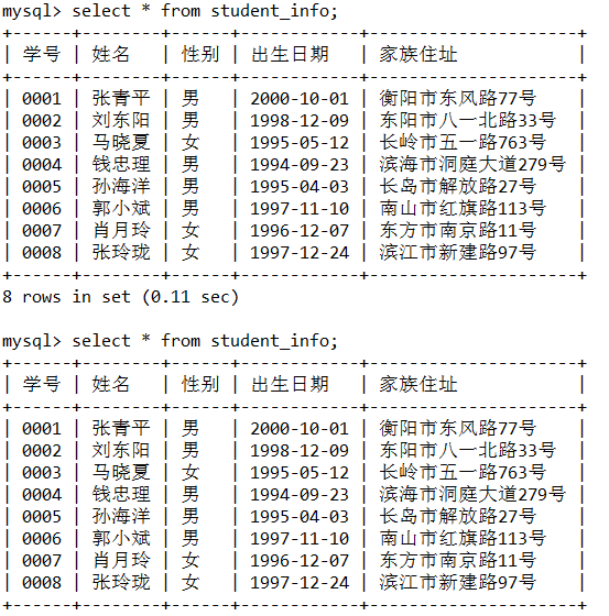 | 0001 | 张青平 | 男 | 2000-10-01 | 衡阳市东风路77号 |