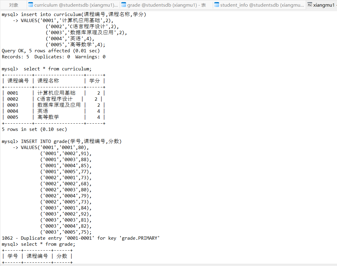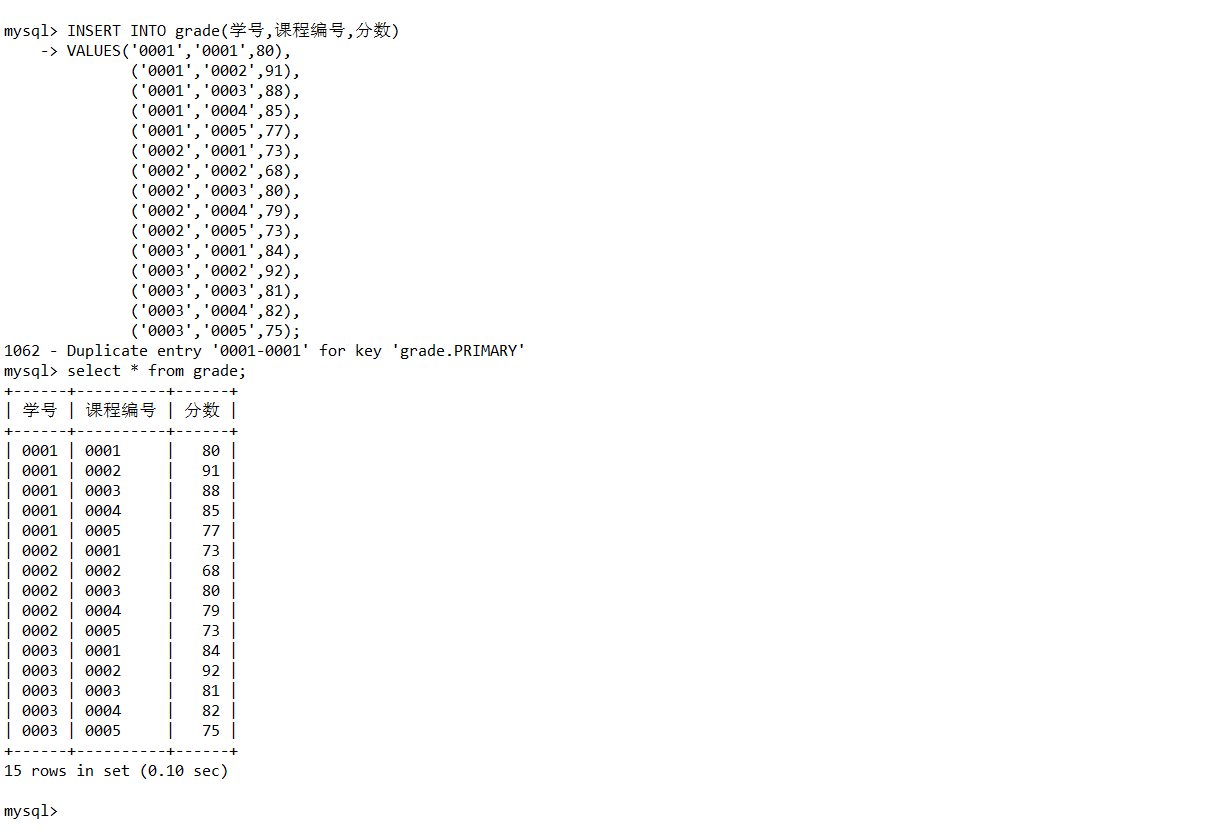 mysql> INSERT INTO grade(学号,课程编号,分数)
